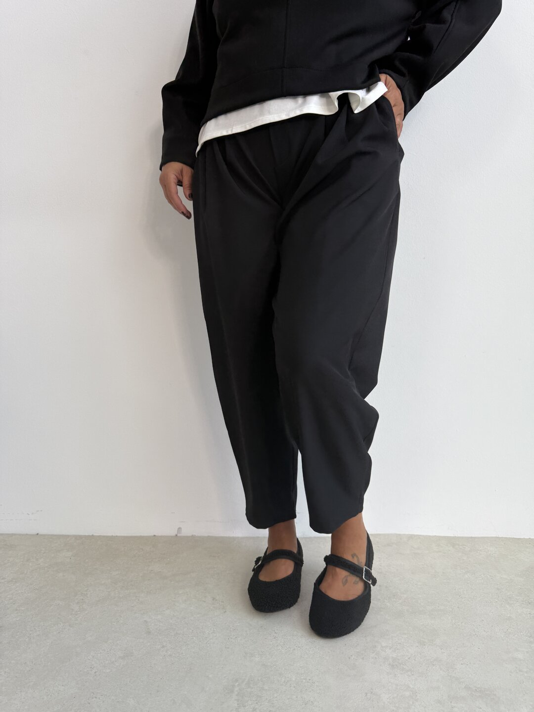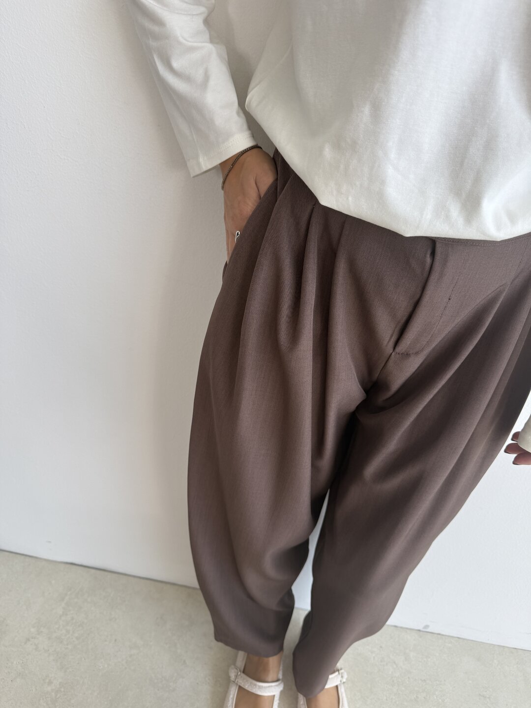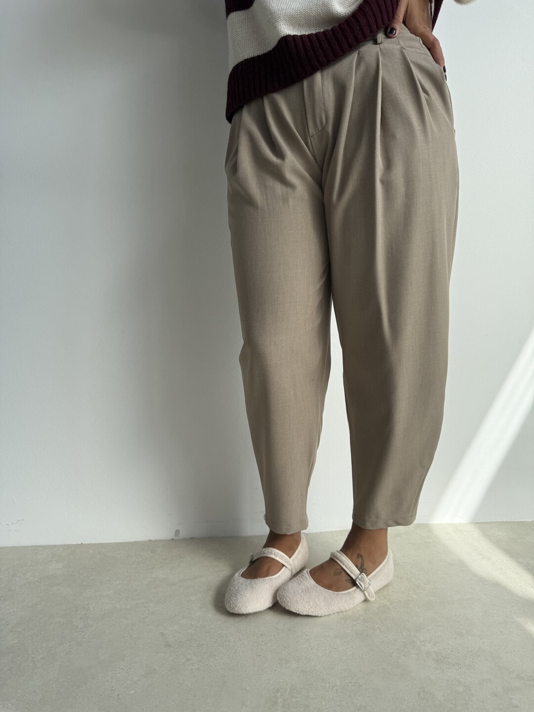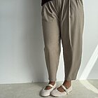 • gamba morbida con pinces sul davanti chiusura con bottone e zip. Modello vita alta con elastico sul retro e tasche laterali.