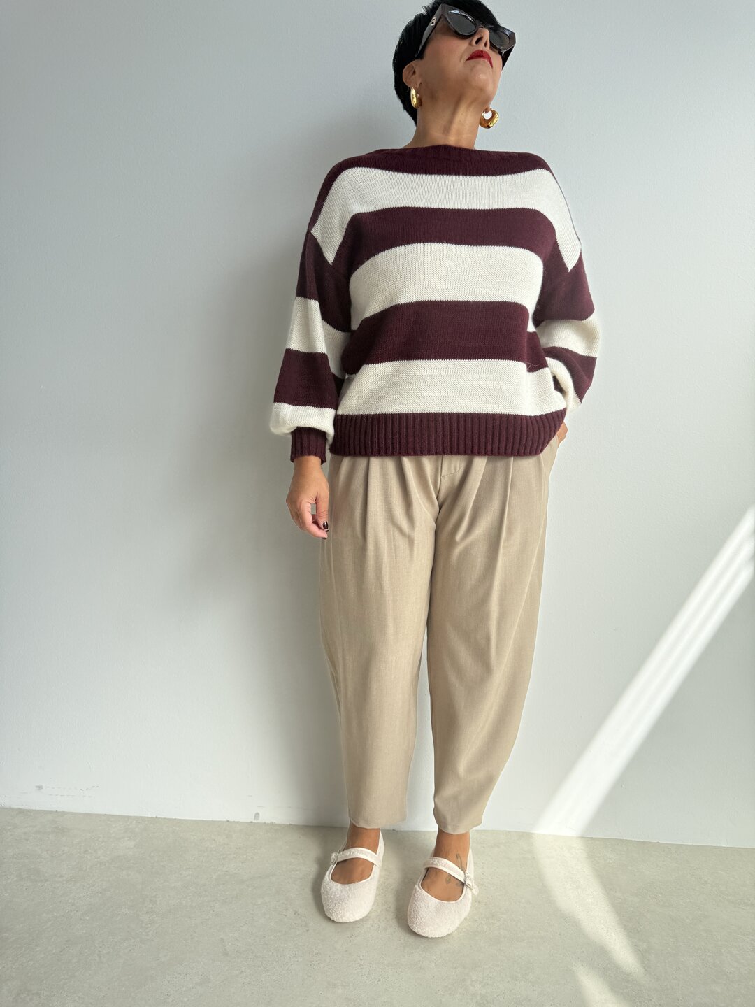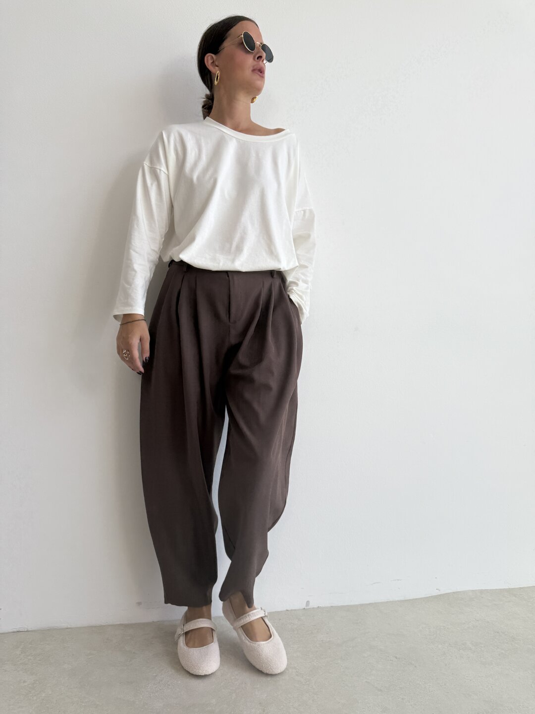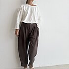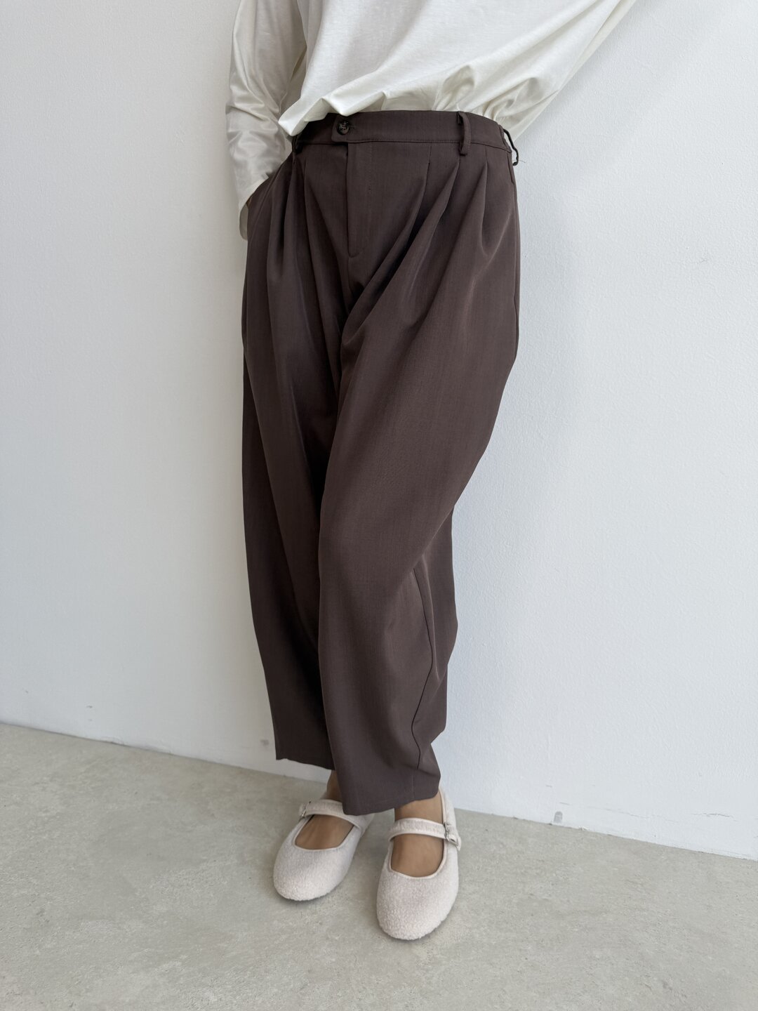 • gamba morbida con pinces sul davanti chiusura con bottone e zip. Modello vita alta con elastico sul retro e tasche laterali.