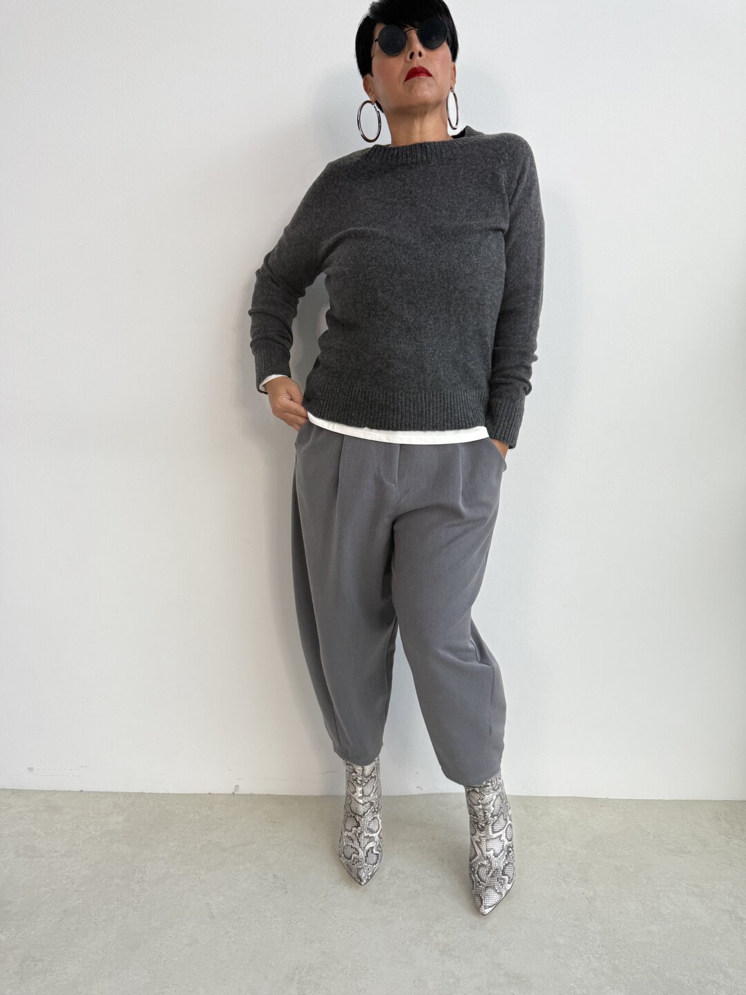 - struttura a palloncino con finta pattina zip. Tasche laterali. Cucitura sulla gambe trasversale per linea ovetto.