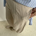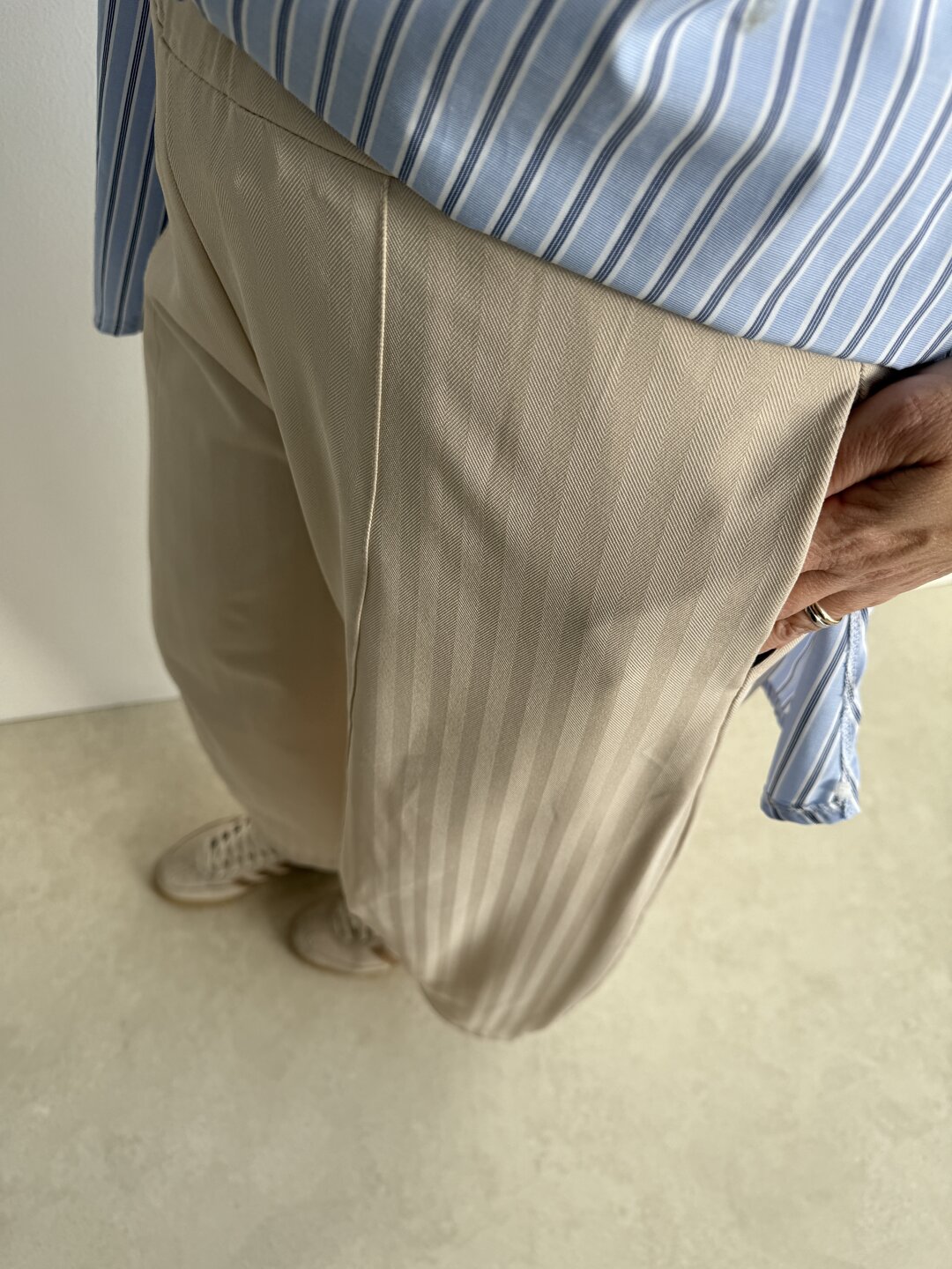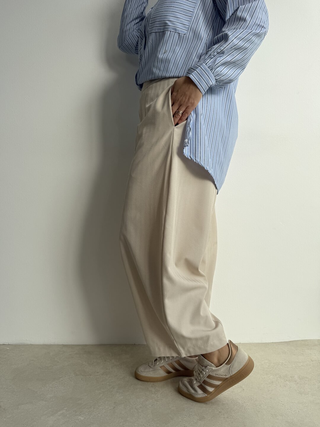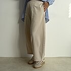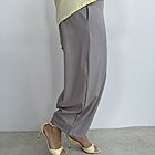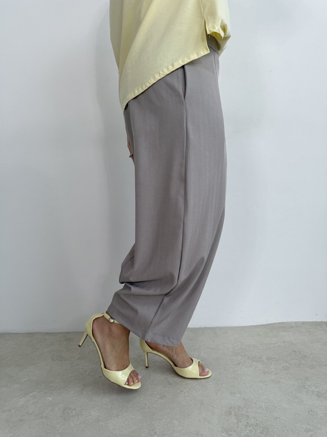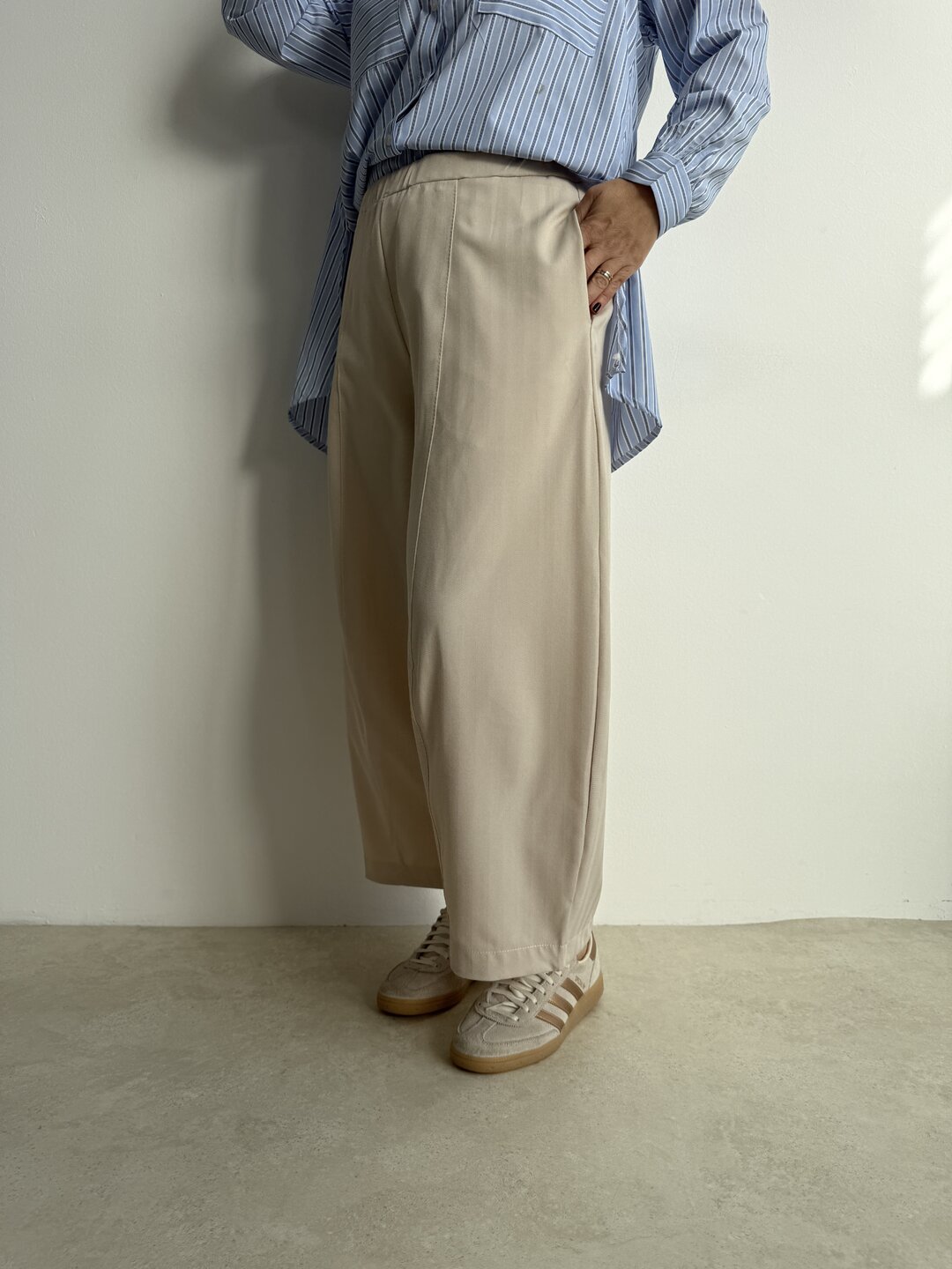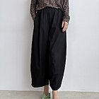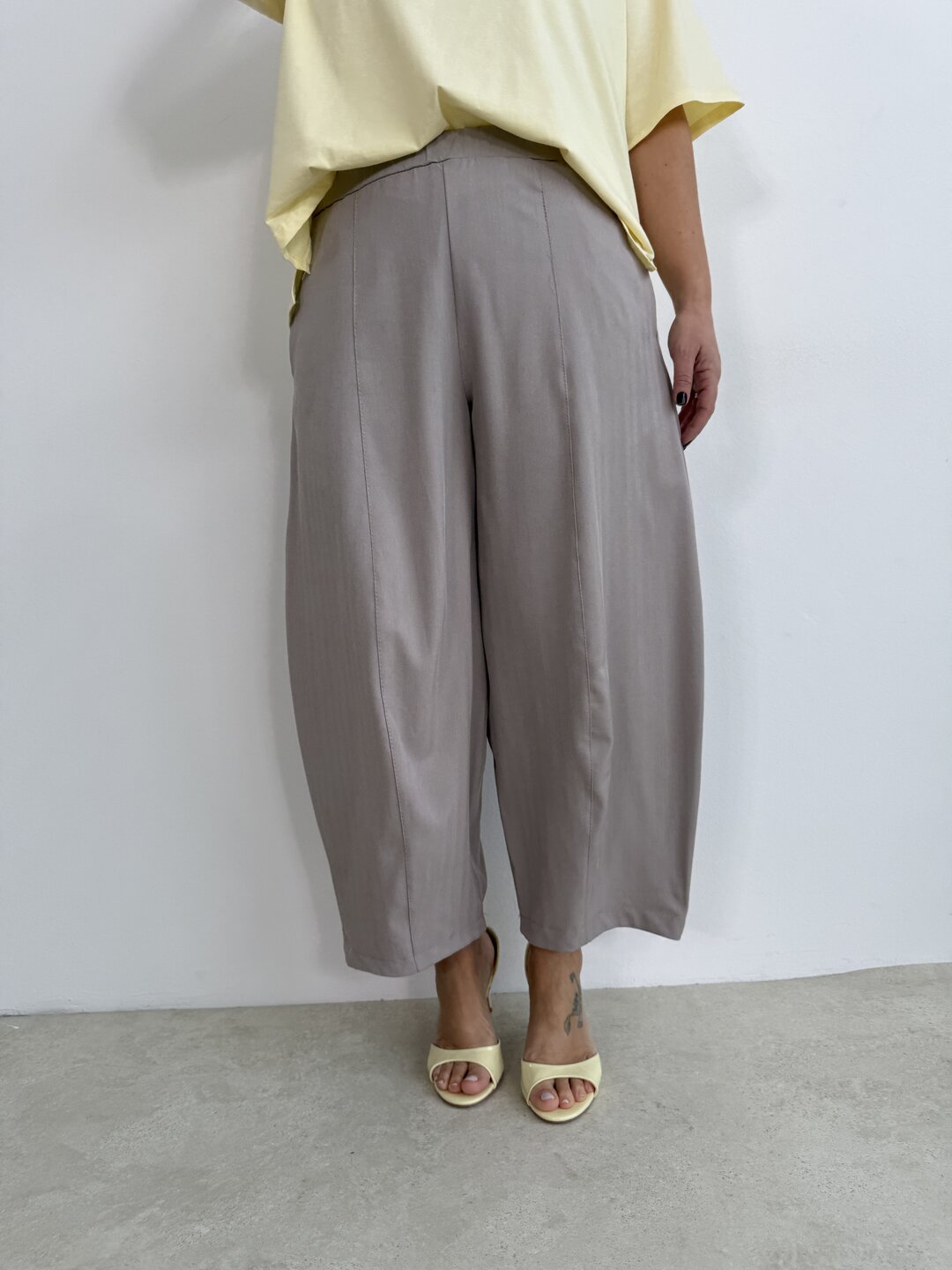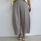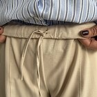 Modello pantalone ovetto con elastico in vita e tasche a filo.