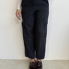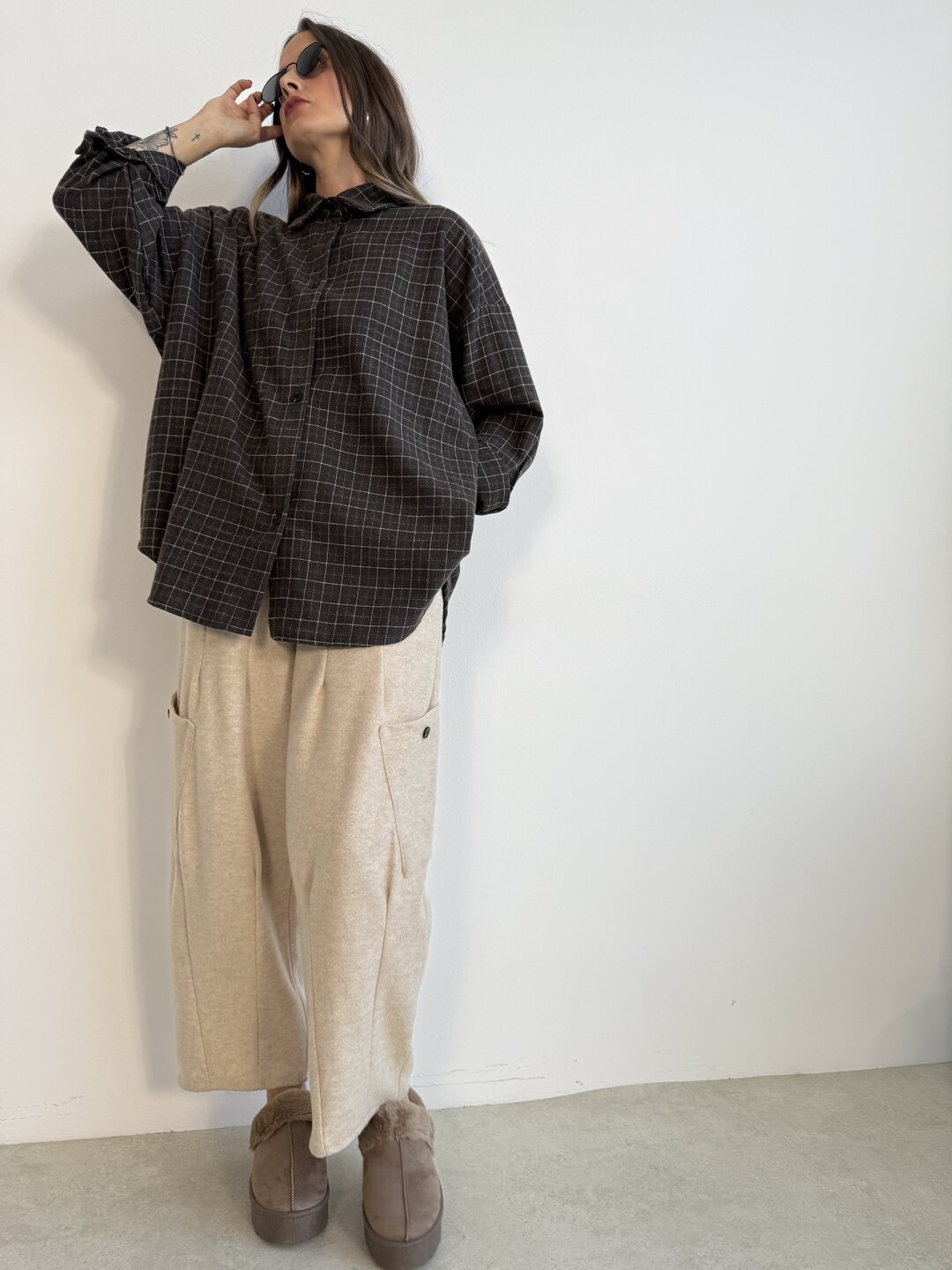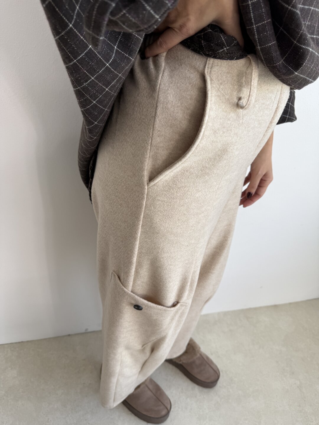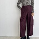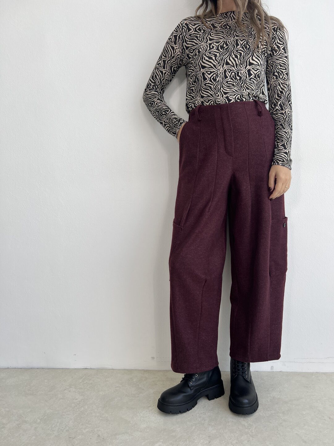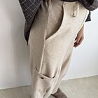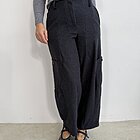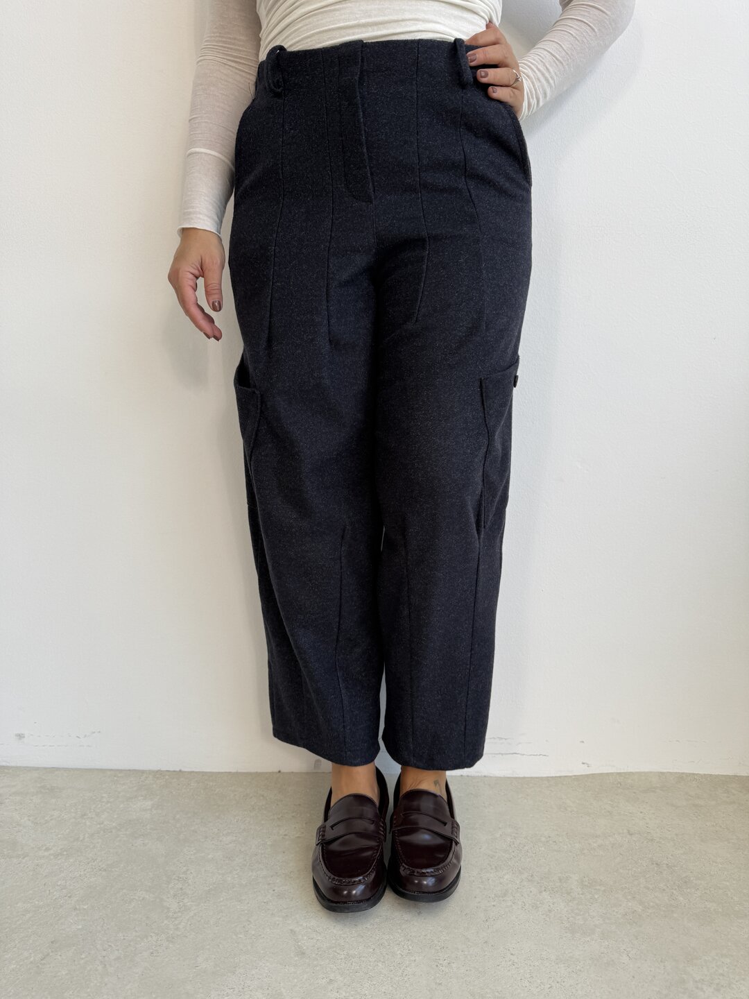 Vita alta con elastico in virìta e passanti fissi per cintura. Tasconi laterali.