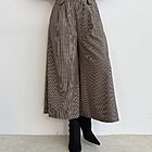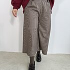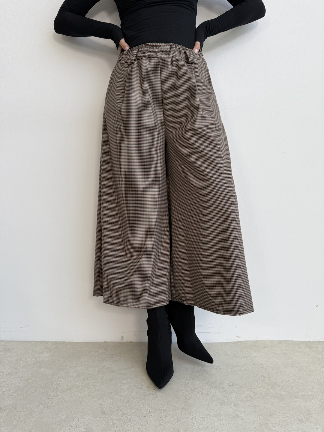 Modello pantagonna culotte. Tasche a filo sul davanti. Elastico sulla parte della cinta retro. Passanti fissi dotato di cintura in ecopelle colore marrone.
