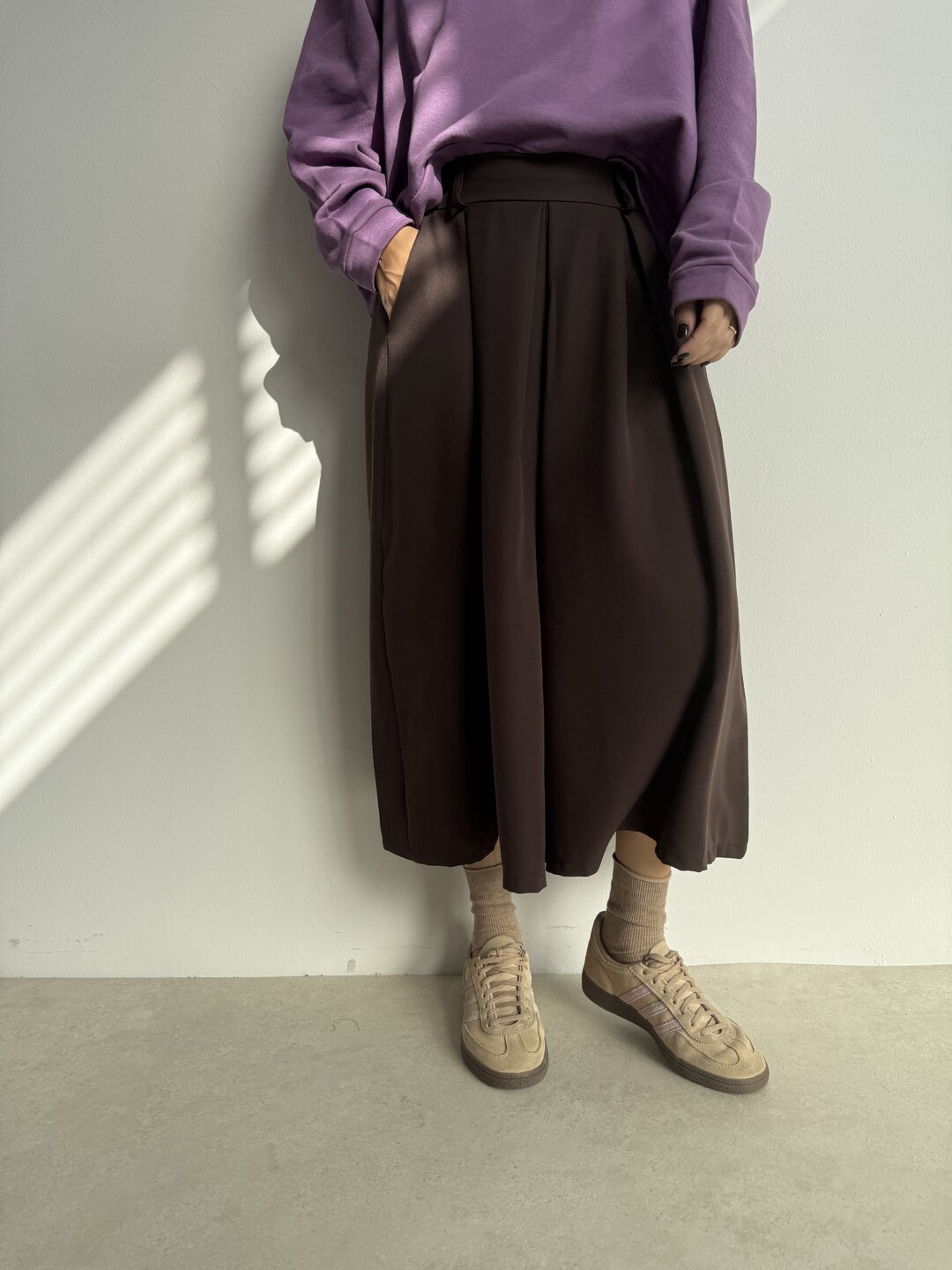• modello pantagonna con pinces e tasche laterali. No bottone e zip ma cinta elasticizzata nel retro. Passanti fissi con cinta in ecopelle rimovibile.