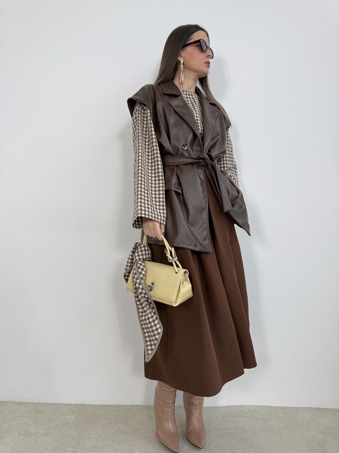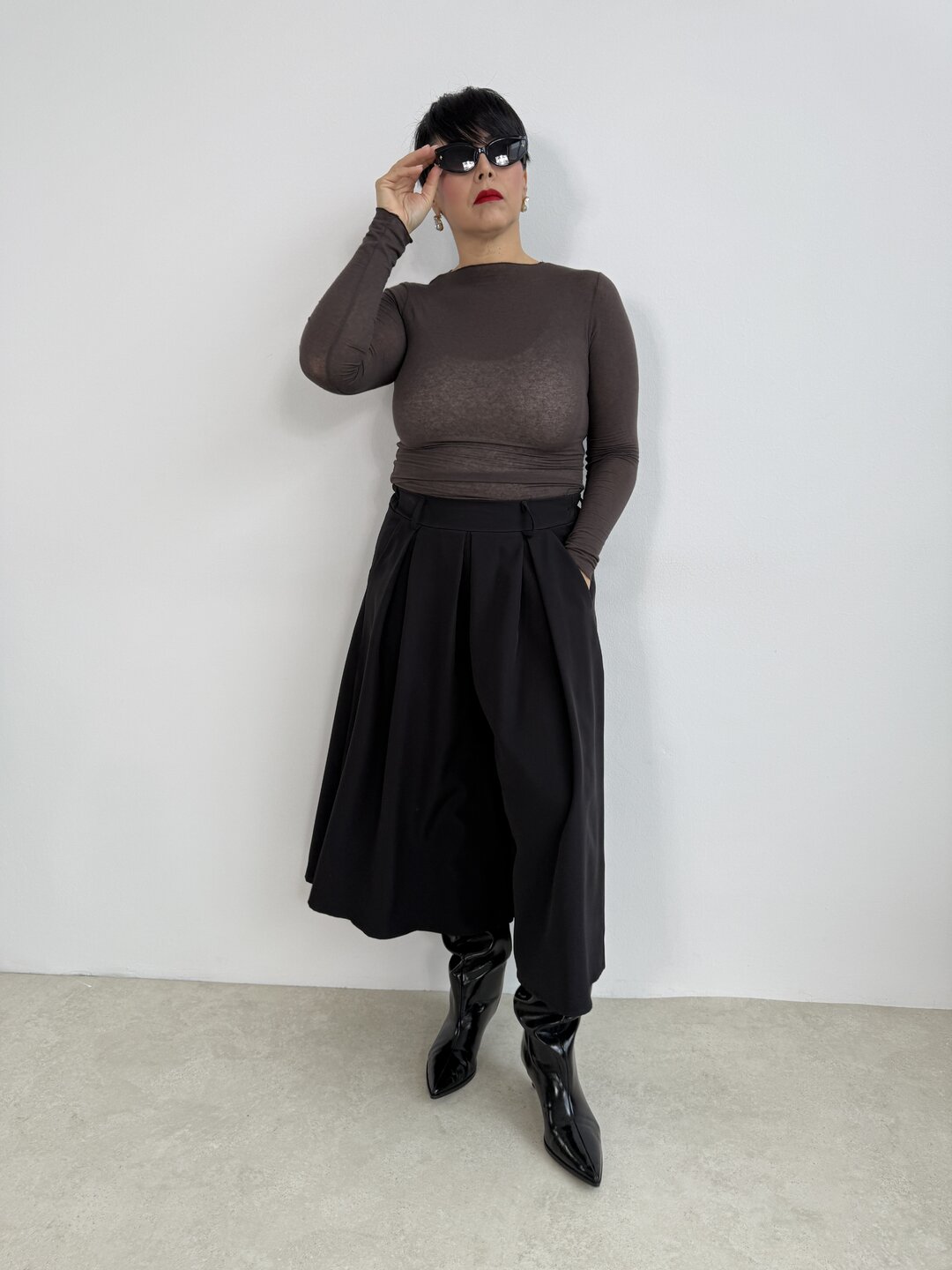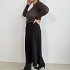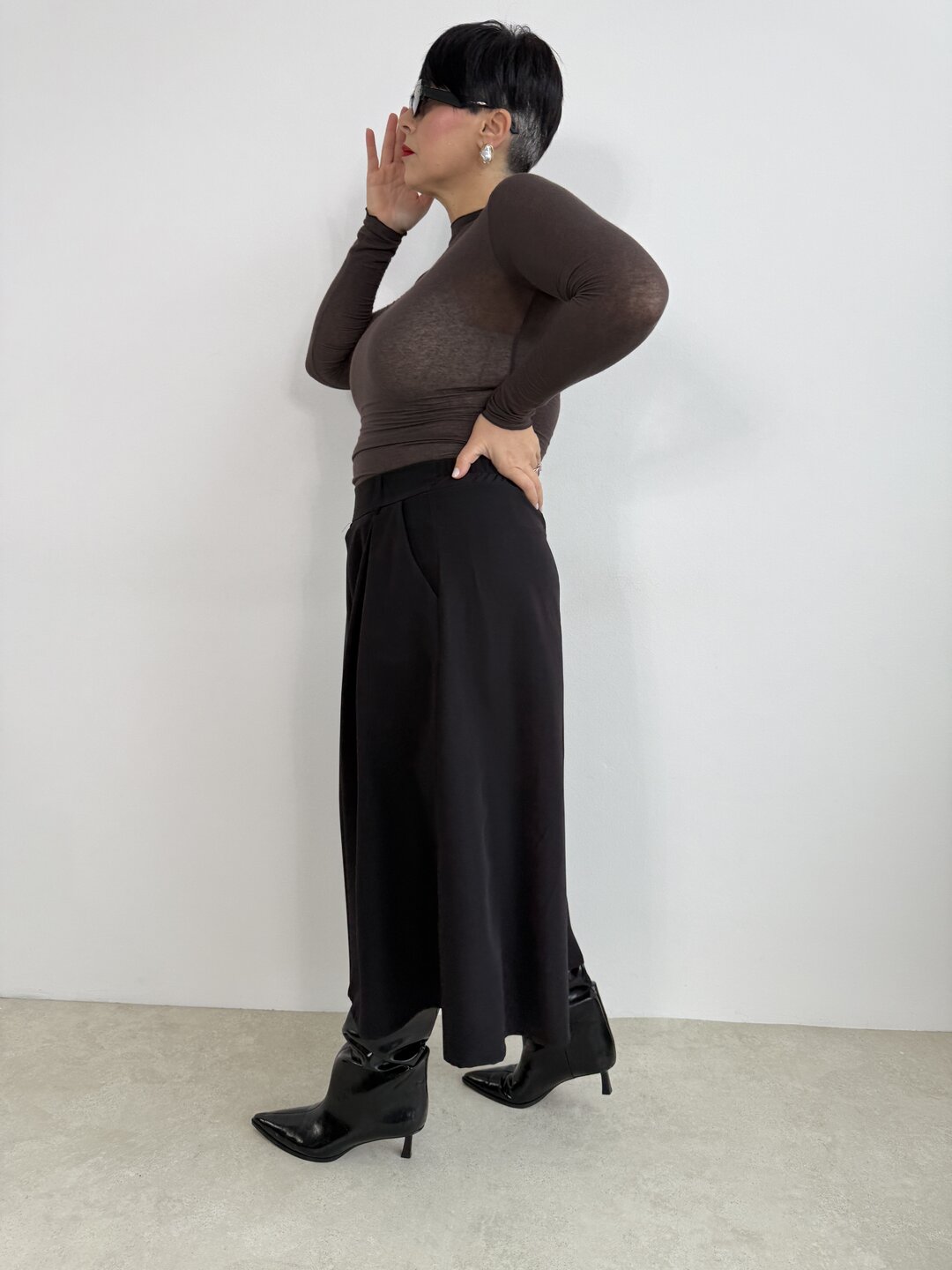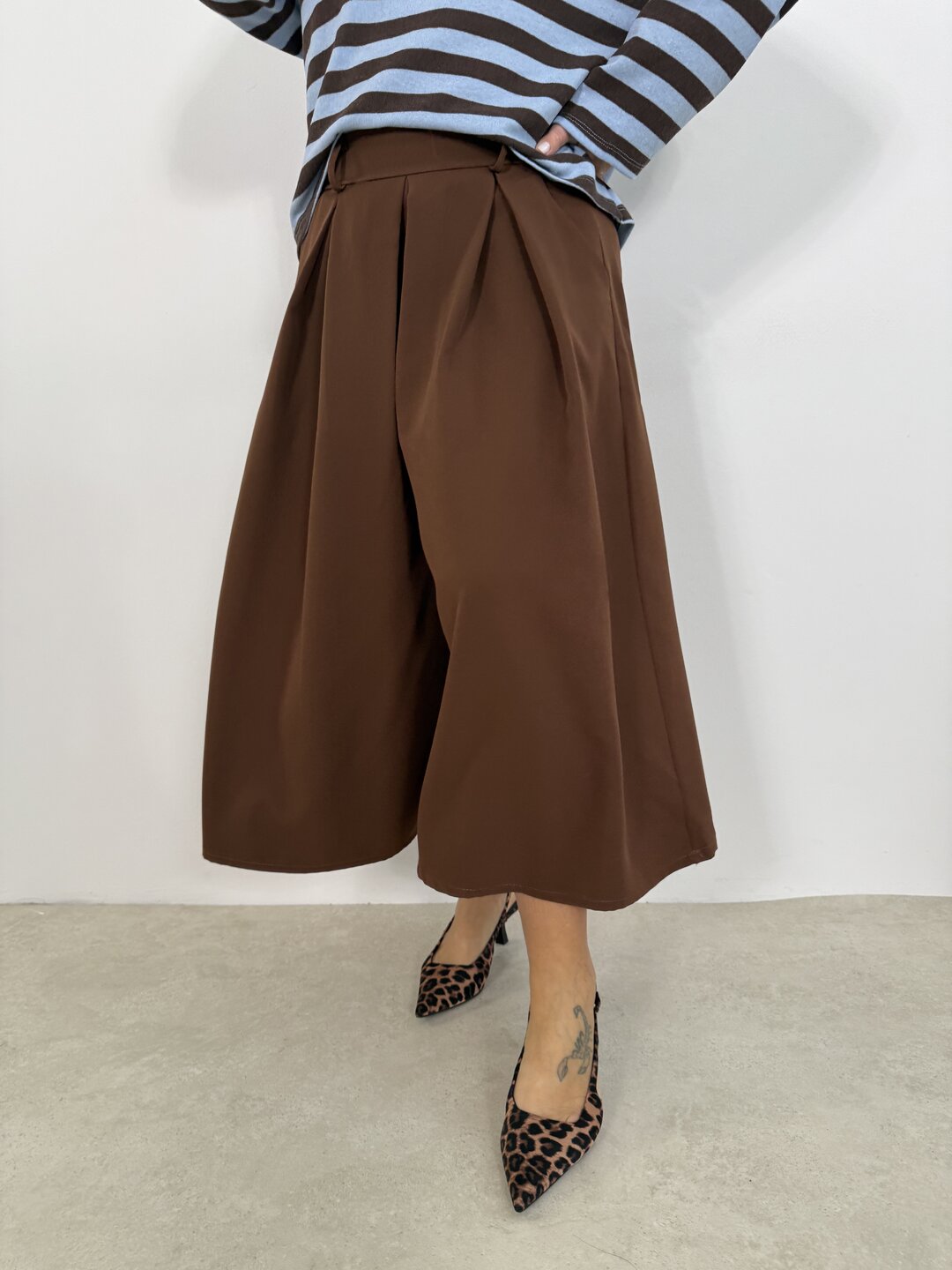 modello pantagonna con pinces e tasche laterali. No bottone e zip ma cinta elasticizzata nel retro. Passanti fissi con cinta in ecopelle rimovibile.