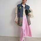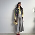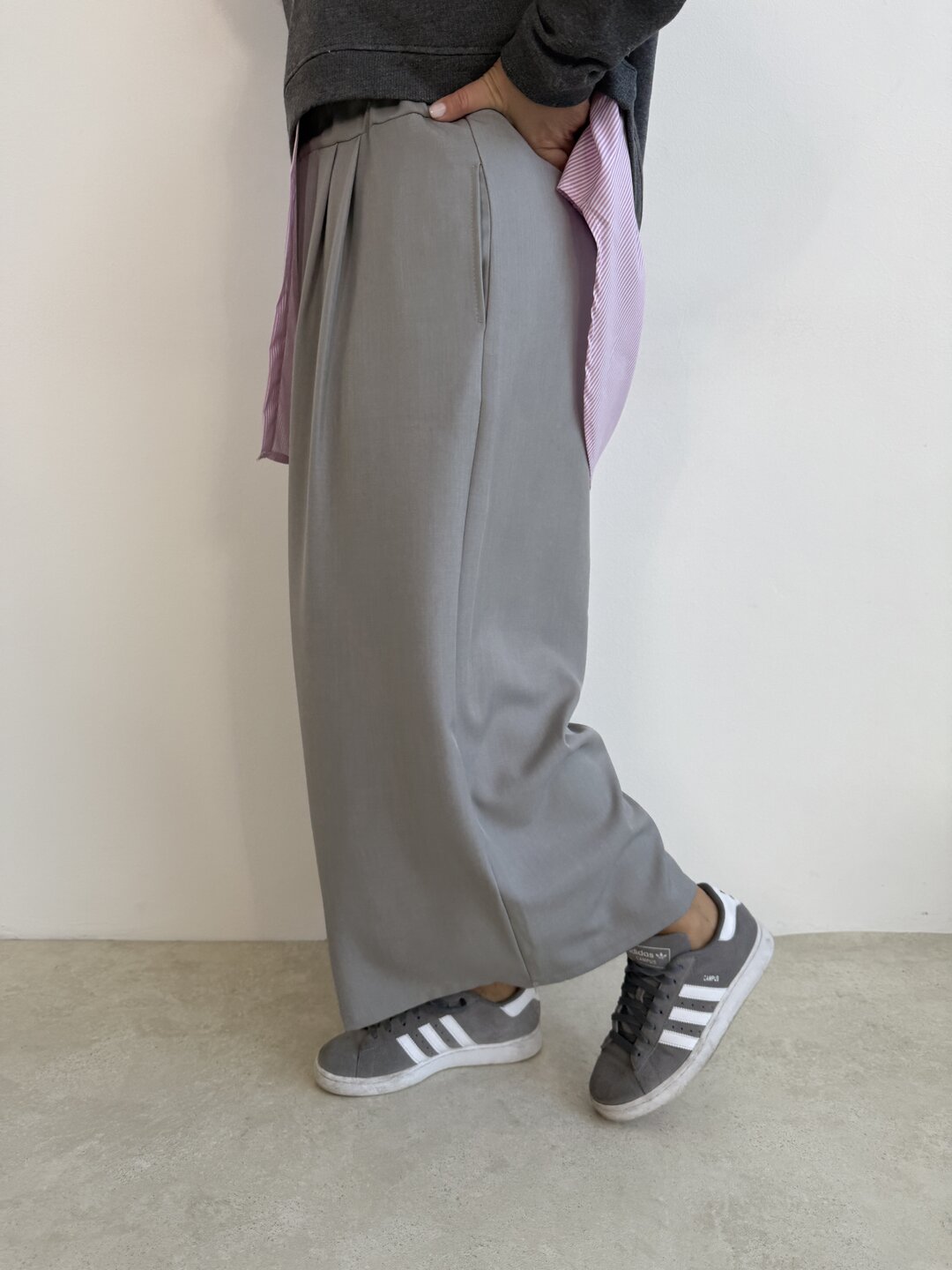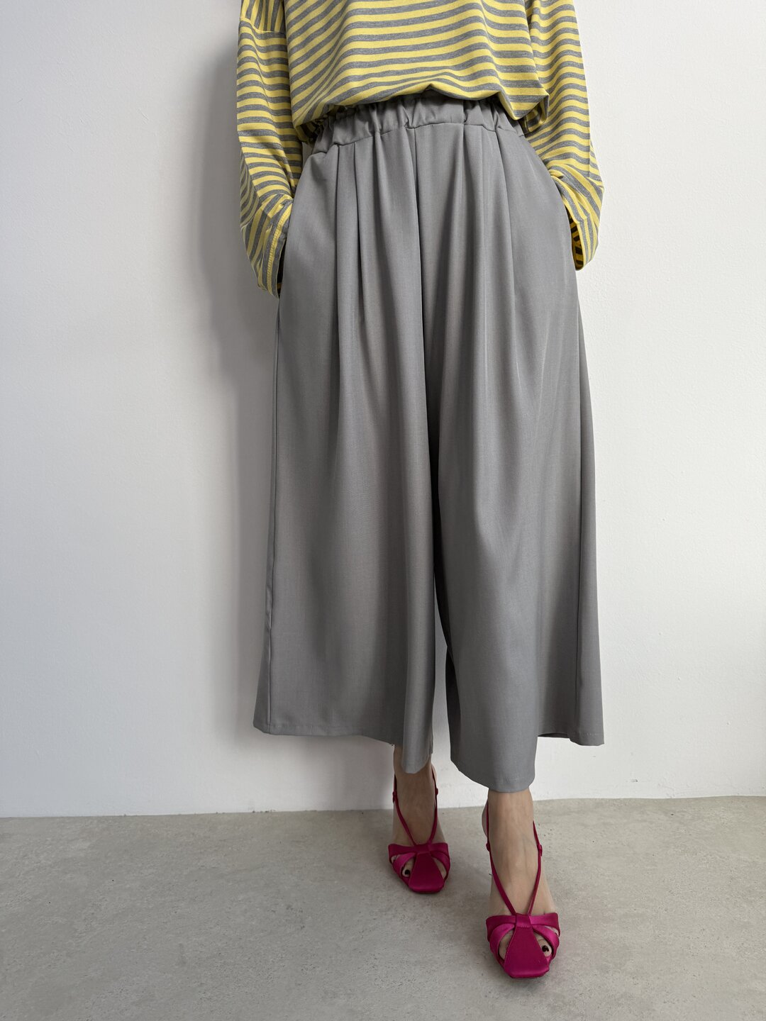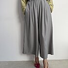 Struttura pantalone modello gonna con molla elasticizzata e arricciata su tutta la circonferenza vita. Tasche laterali.