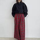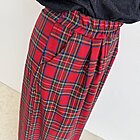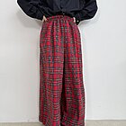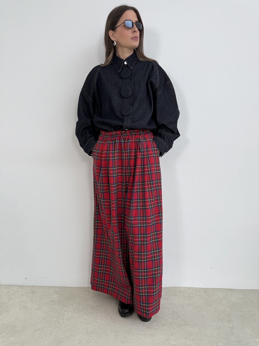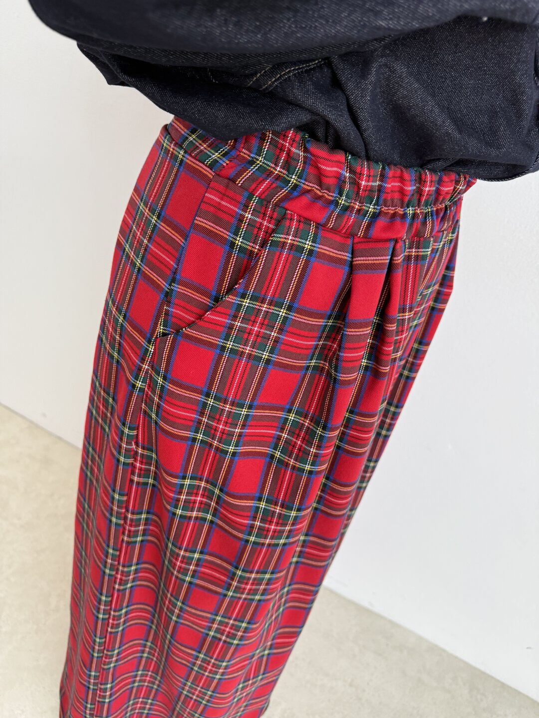 Modello pantalone/gonna a scacco tartan rosso con elastico in vita e tasche laterali.