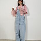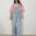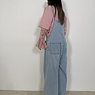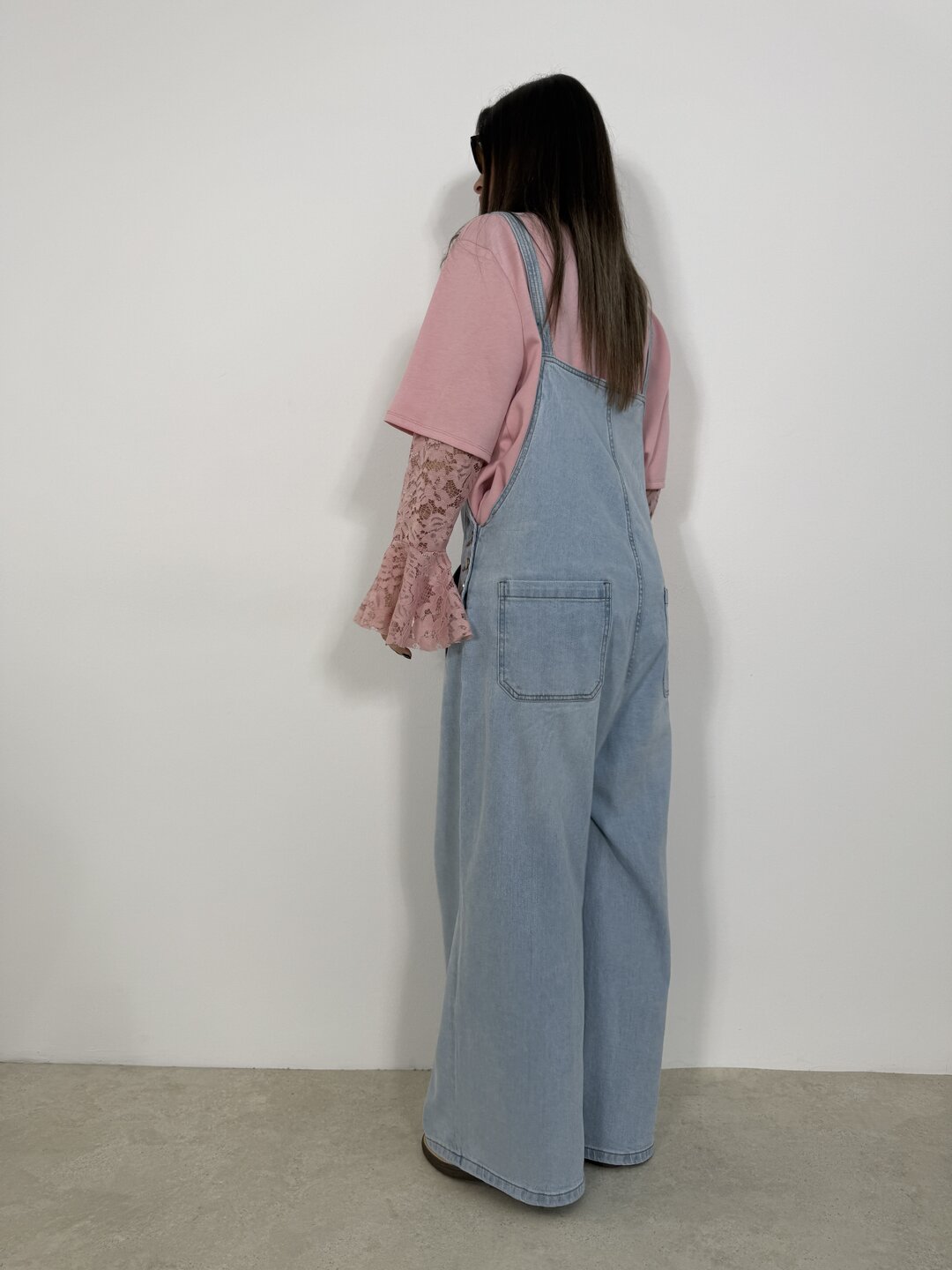 Modello salopette in denim dritto con tasca a canguro sul davanti e bretelle regolabili con bottone automatico.