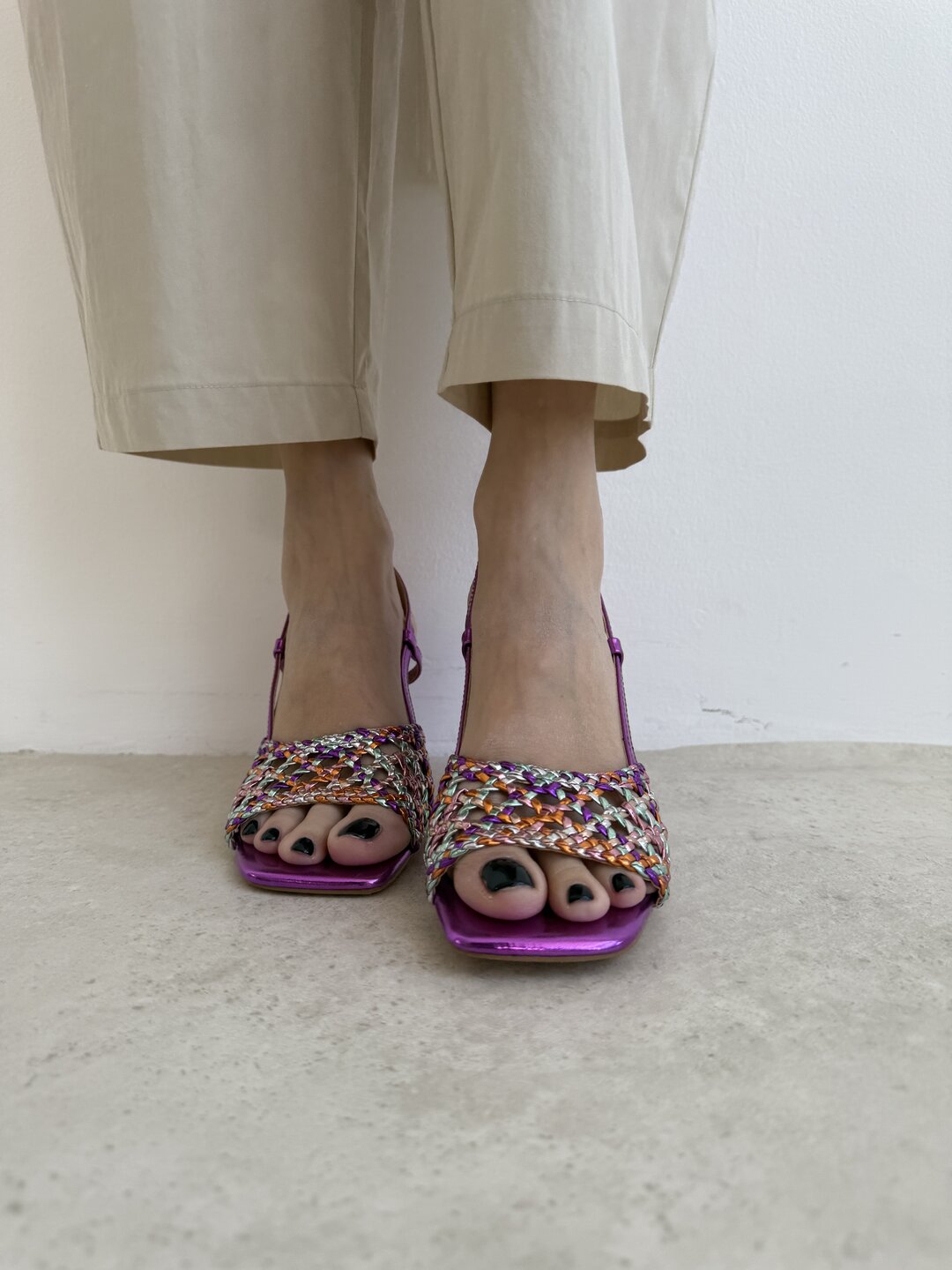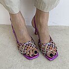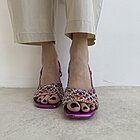 Dettaglio rete sulla parte anteriore. Tacco altezza 8 cm. Chiusura con fibbia dietro alla caviglia.