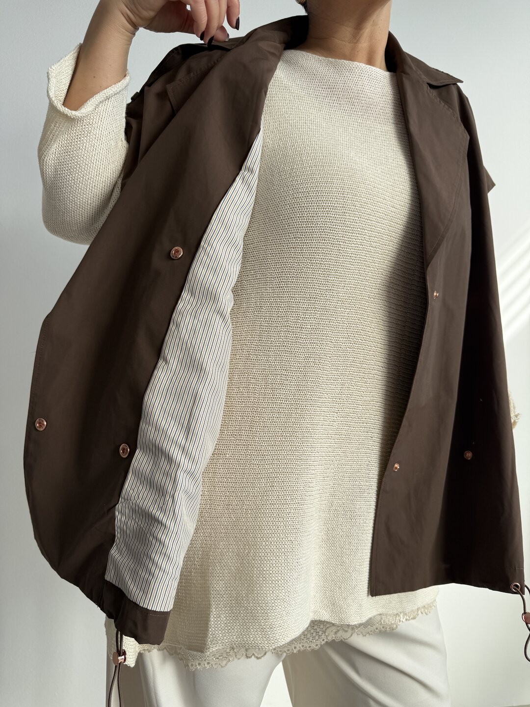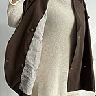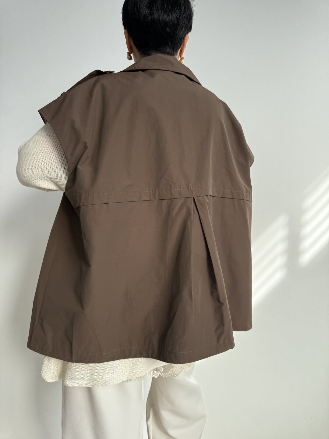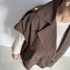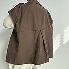Modello gilet over smanicato. Allacciatura a doppio petto con bottoni a clip. Due tasche. Coulisse in fondo. Foderato.