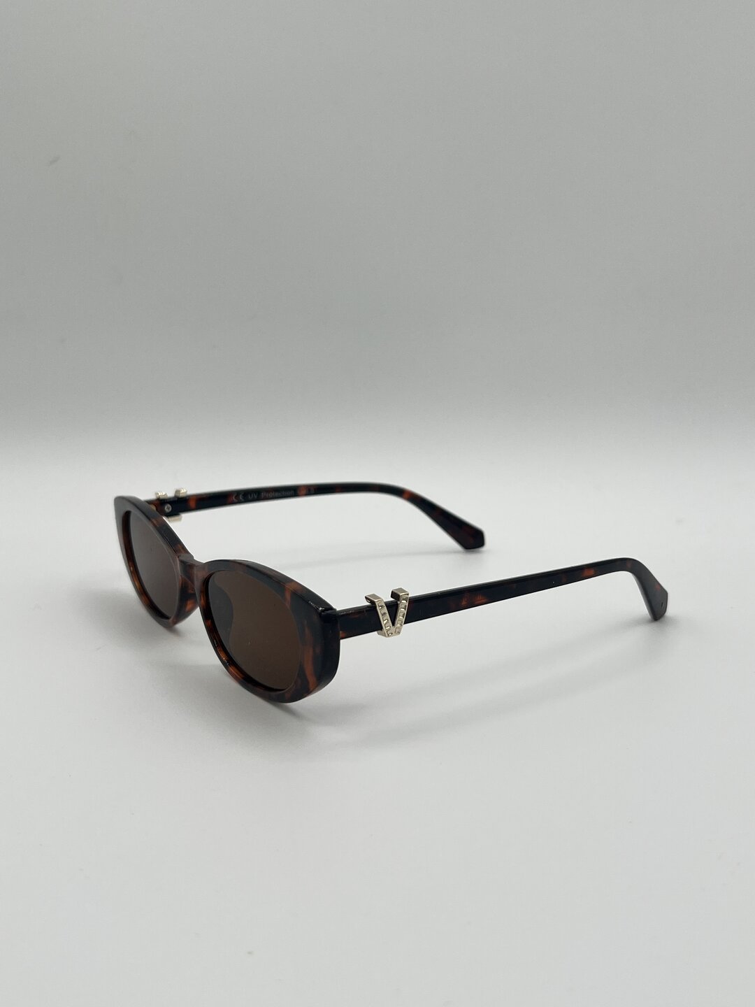 Forma ovale schiacciata, con lenti colore marrone e montatura maculata.