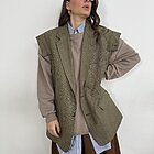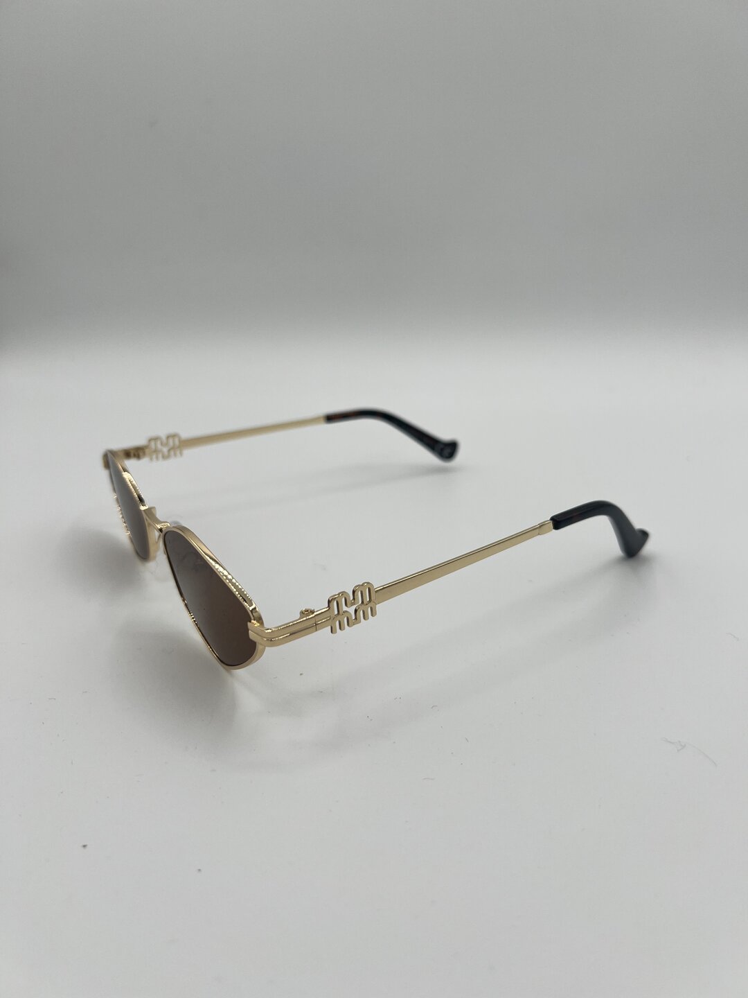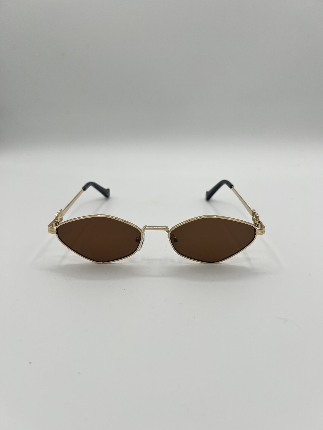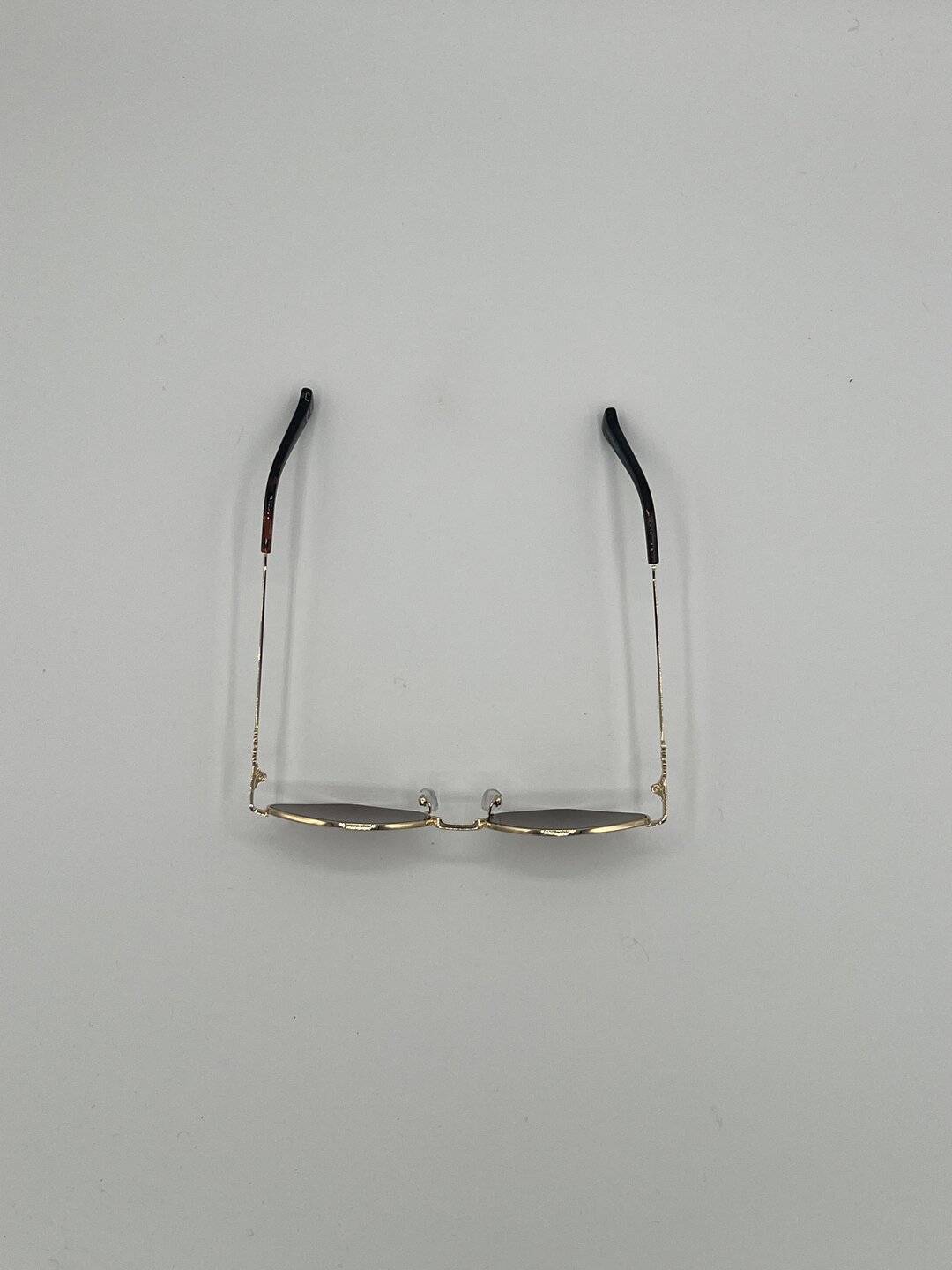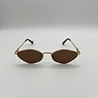 Forma sagomato semi rombo schiacciata, con lenti colore marrone e montatura extra light oro.