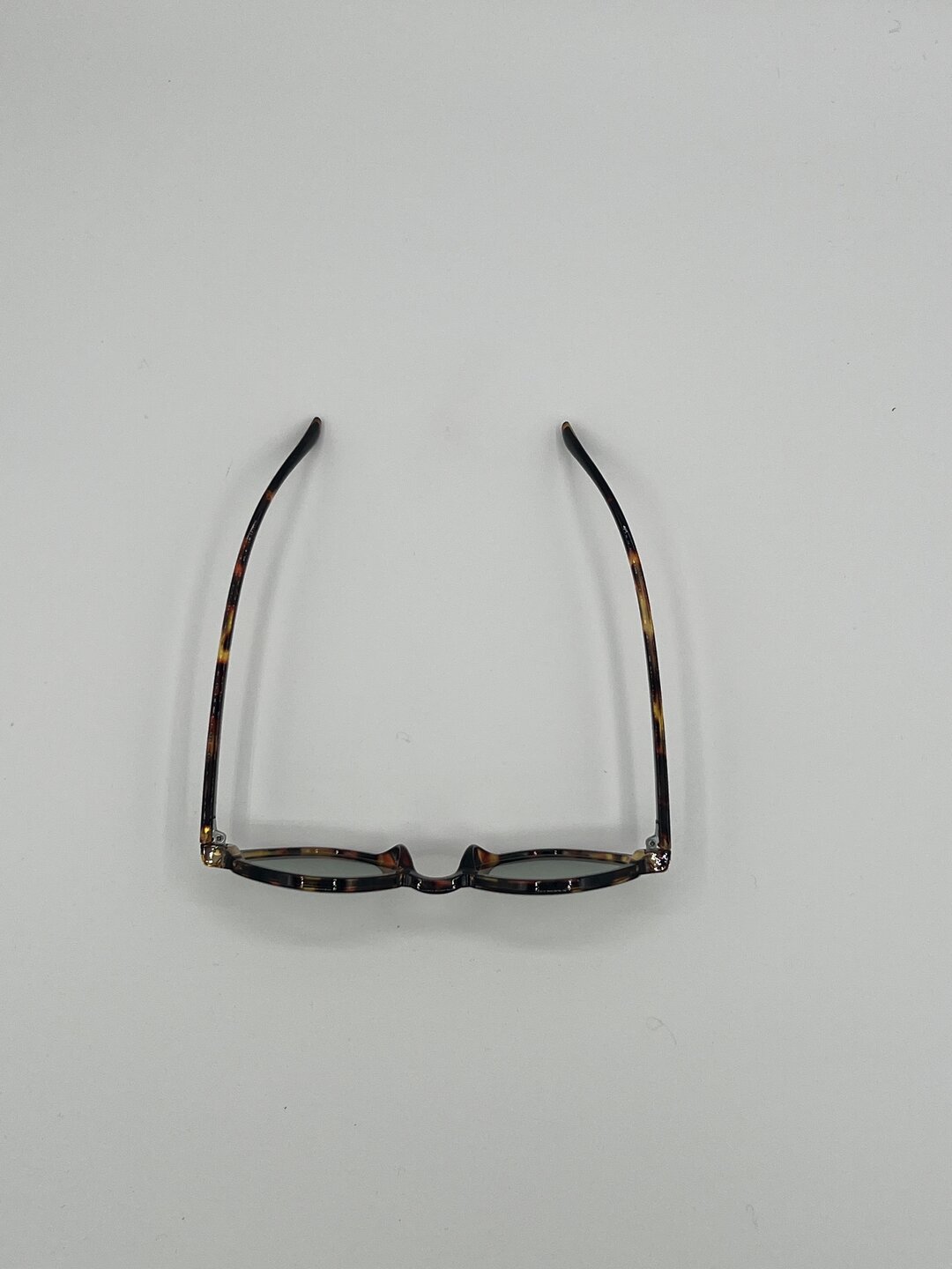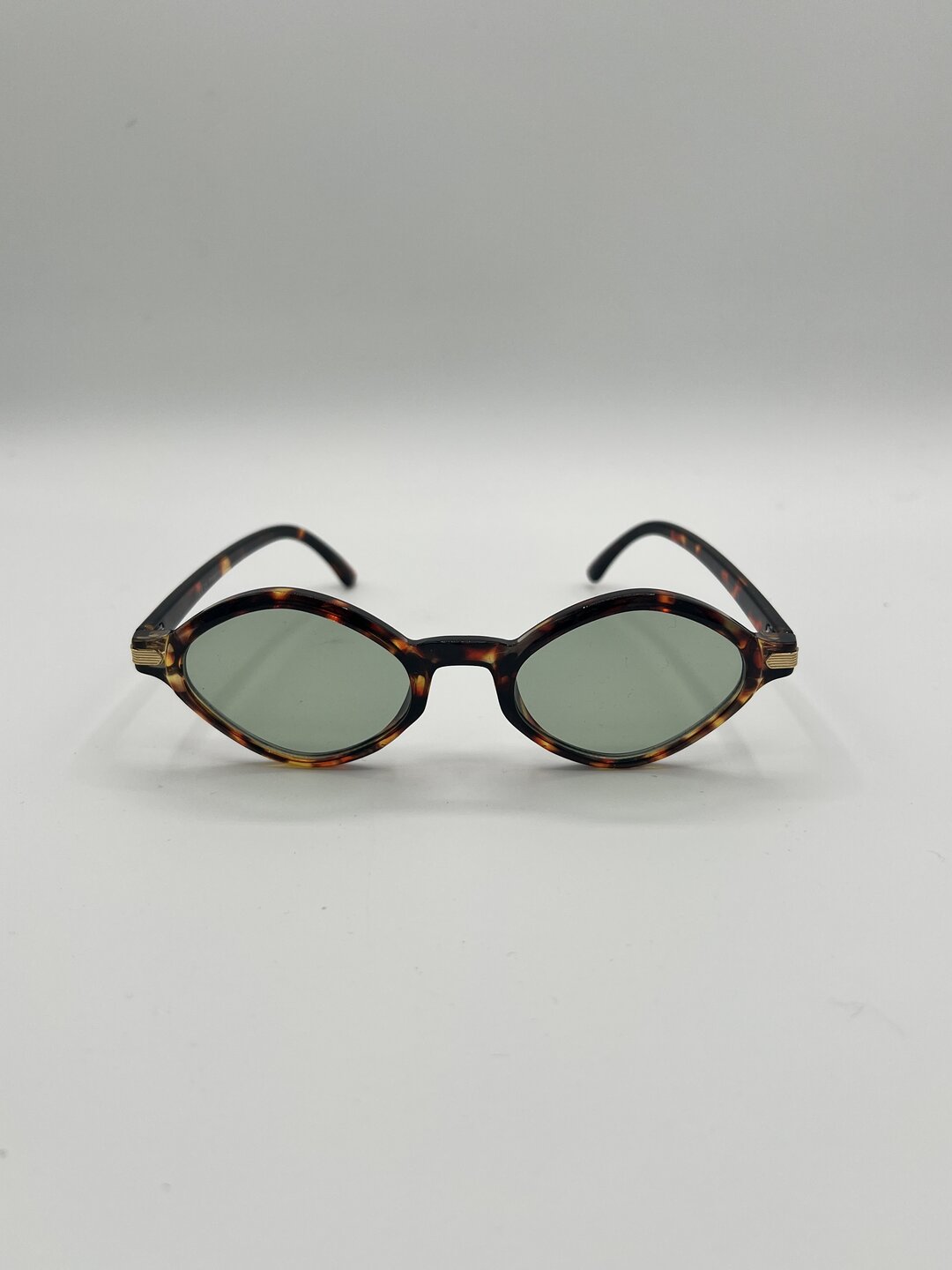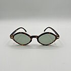 Forma semi rombo schiacciata, con lenti colore verde e montatura maculata.