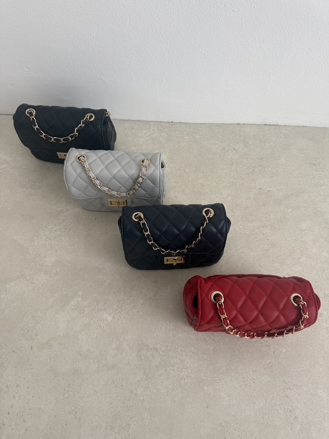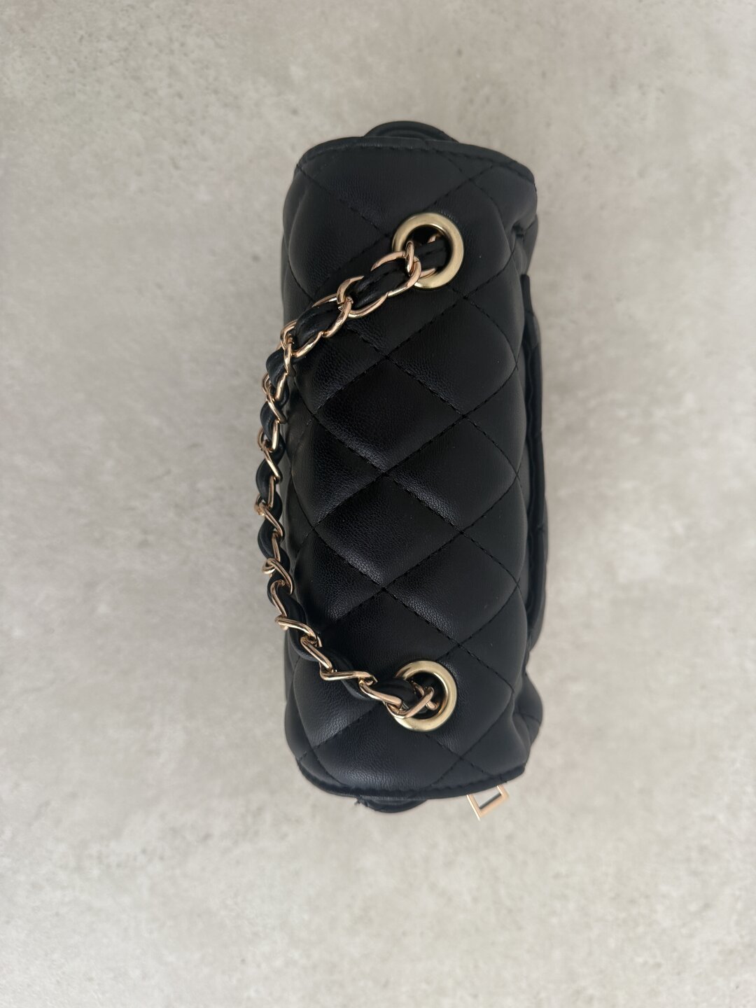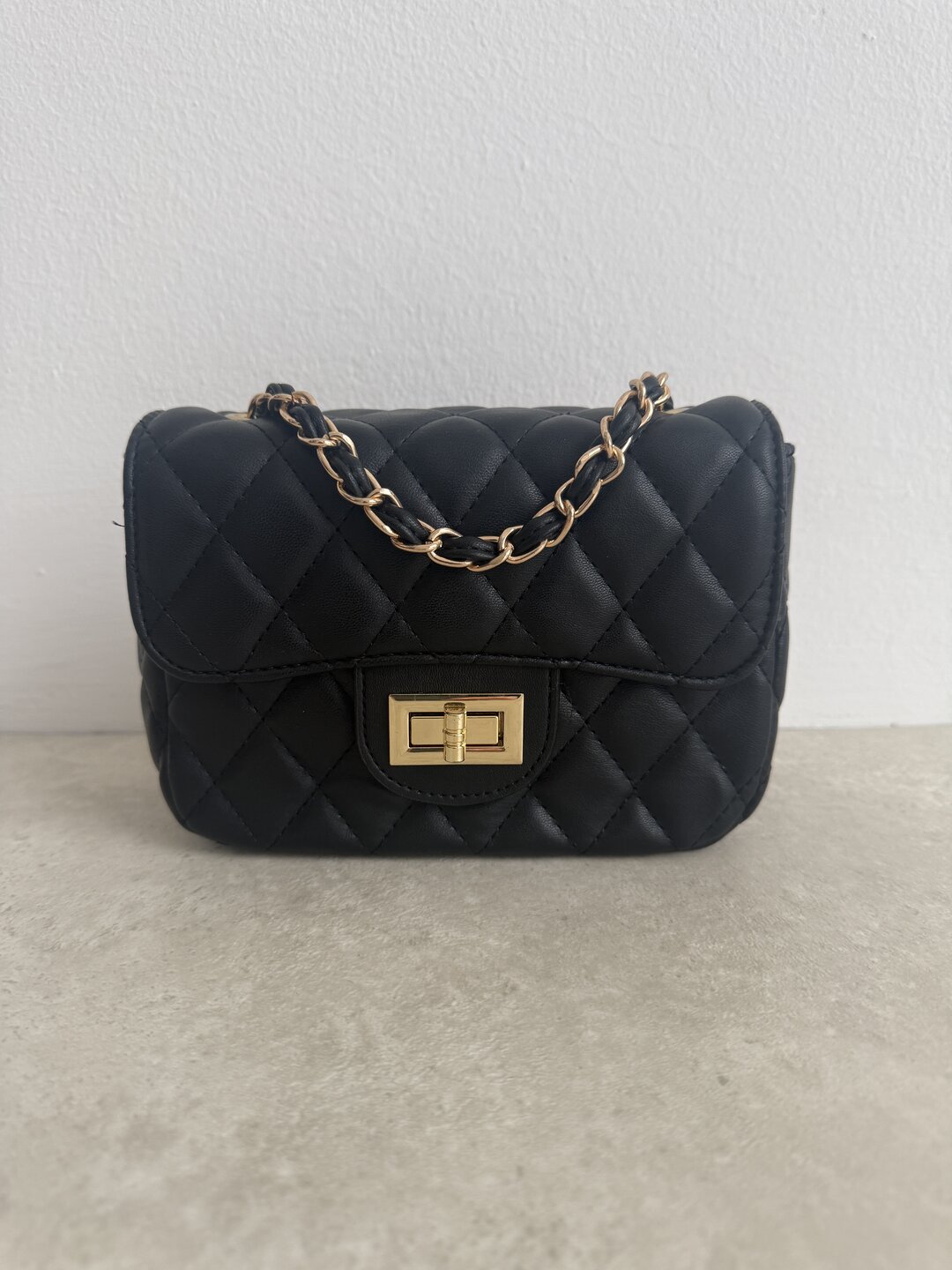 Modello trapunto con tracollina a catena oro regolabile. Chiusura sotto patta con zip. Taschina interna.