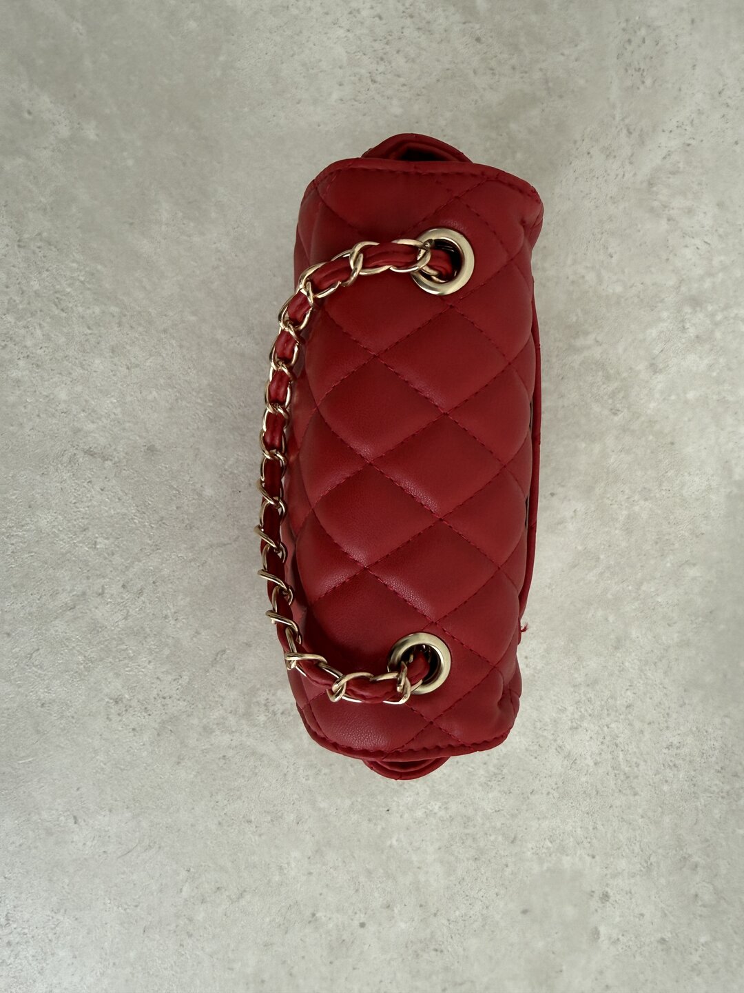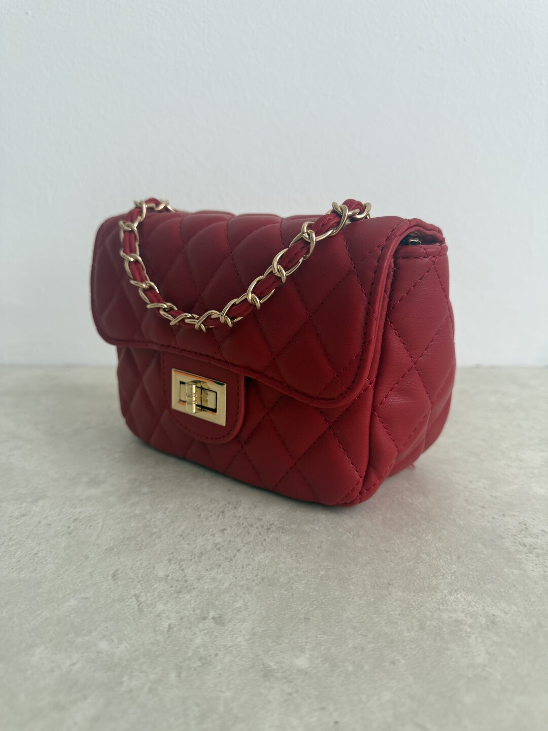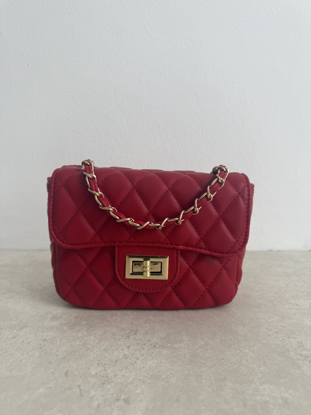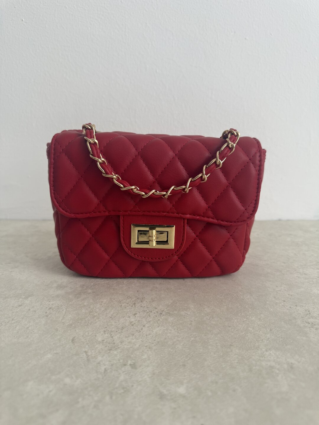 Modello trapunto con tracollina a catena oro regolabile. Chiusura sotto patta con zip. Taschina interna.