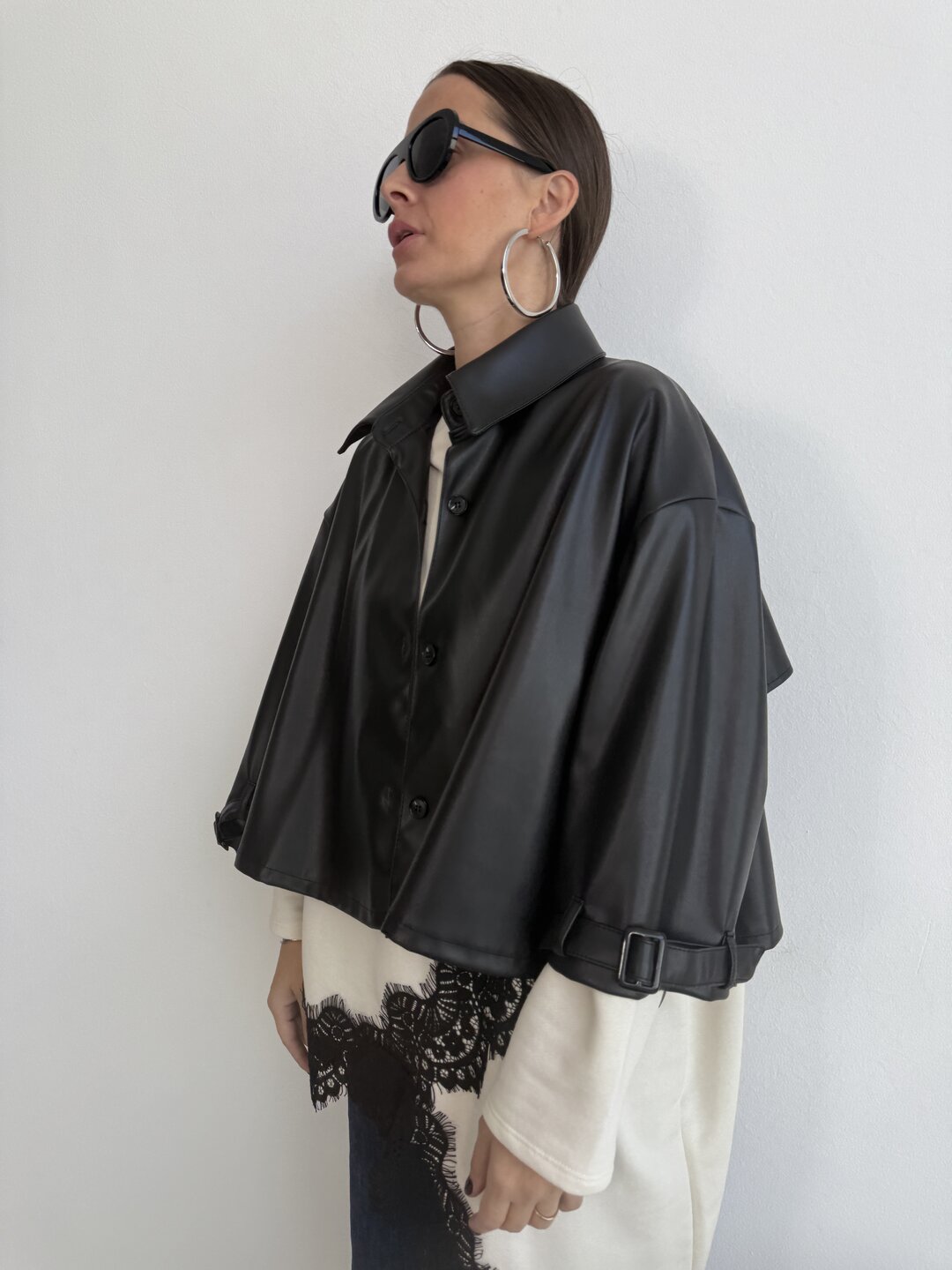 - trench monopetto in ecopelle con mantellina sul retro. Presenta tasche laterali. Chiusura anteriore con bottoni. Fit regolare svasato a trapezio. Manica 3/4 a svasare.