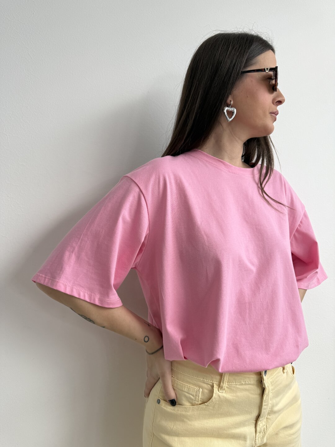 modello t-shirt over a girocollo. Manica corta con spalla scesa.