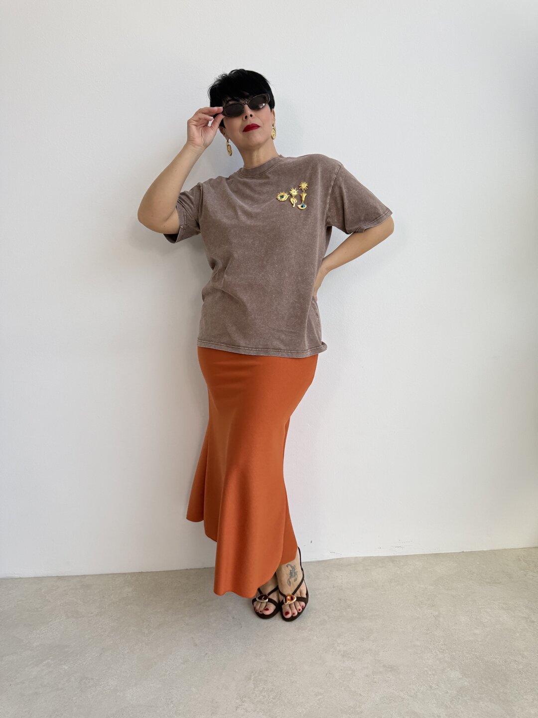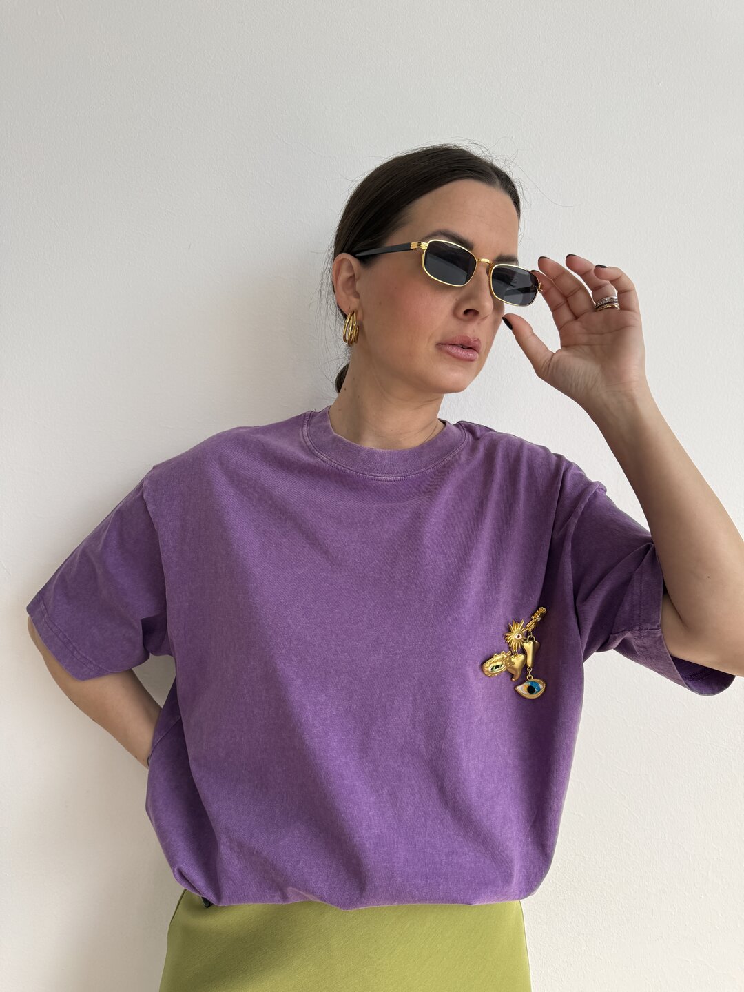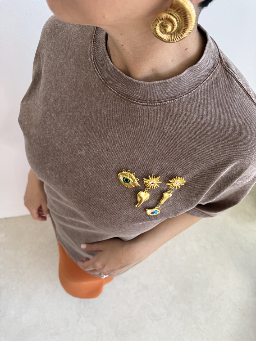 modello over a girocollo con spalla scesa. Effetto sfumato. Dettaglio spille removibili.